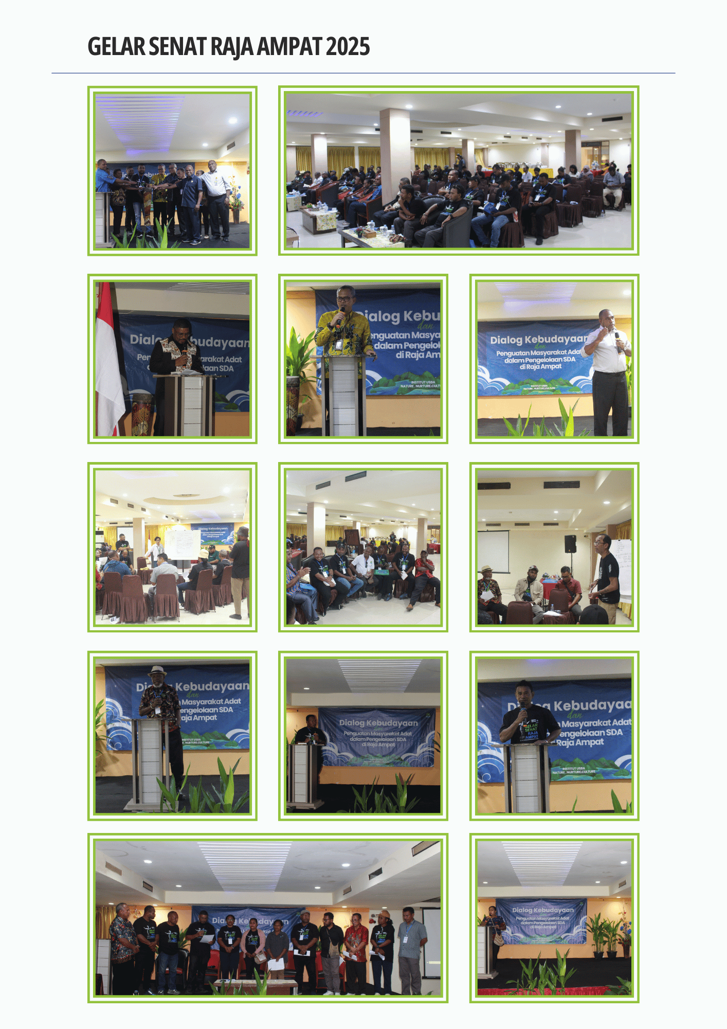 Sebagai tindak lanjut langsung dari proses sosialisasi, Institut USBA menyelenggarakan Gelar Senat Raja Ampat pada 1–3 Oktober 2025 di Hotel Mariat, Sorong, bekerja sama dengan Forum Komunikasi Masyarakat Adat Raja Ampat. Kegiatan ini dikemas dalam sebuah forum Dialog Kebudayaan dan Penguatan Masyarakat Adat dalam Pengelolaan Sumber Daya Alam.